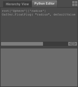 With the built-in Python Editor, you can build and modify the node graph, test API code and syntax, return plug values, and query scenes and images. In the default layout, the editor is in the bottom-right panel, under a tab next to the Hierarchy View.