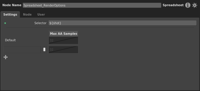 You’ll notice that the Default row has taken the value of the Max Samples plug, 32, and is disabled. This will be the plug’s fallback value for when ${shot} doesn’t match any row’s pattern, which would be the case if a new shot is added to our project. If we wanted a different fallback value, we could enable the cell and change it. Since this graph is responsible for the main renders, we should be dictating the render options in all cases. So, enable the column’s cell in the Default row.