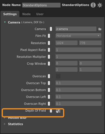 - On a downstream StandardOptions node, enable the Depth Of Field plug (click