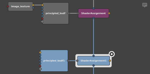 4. Interject the new ShaderAssignment1 node after the first ShaderAssignment node.