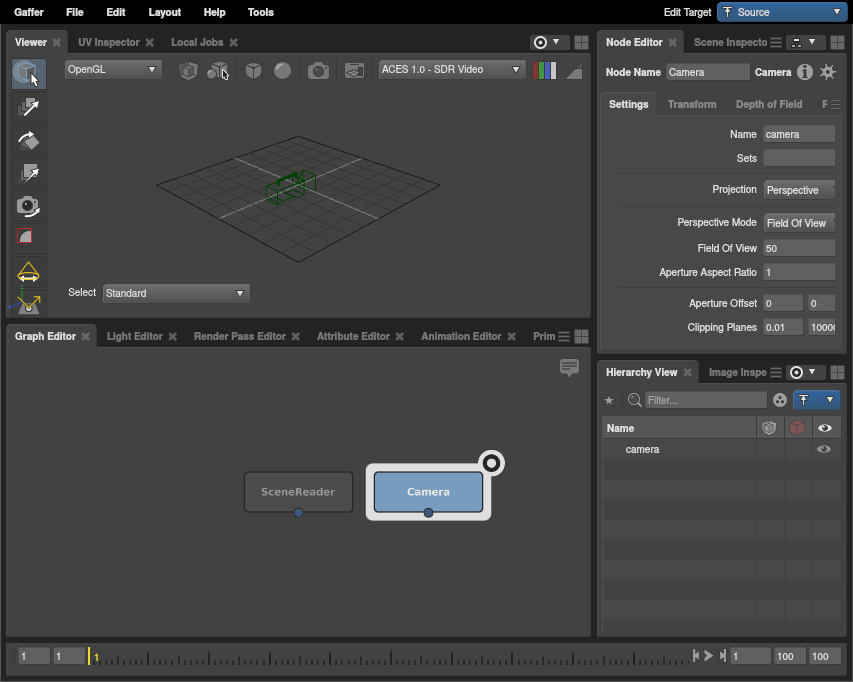 In Gaffer, there is no single data set of locations and properties that comprise the sequence’s scene. In fact, a Gaffer graph is not limited to a single scene. Instead, when a node is queried, a scene is dynamically computed as that node’s output. You can test this by clicking the background of the Graph Editor. With no node selected, the Hierarchy View goes blank, because there is no longer a scene requiring computation. Thus, no scene exists. Since scenes are computed only when needed, Gaffer has the flexibility to support an arbitrary quantity of them.