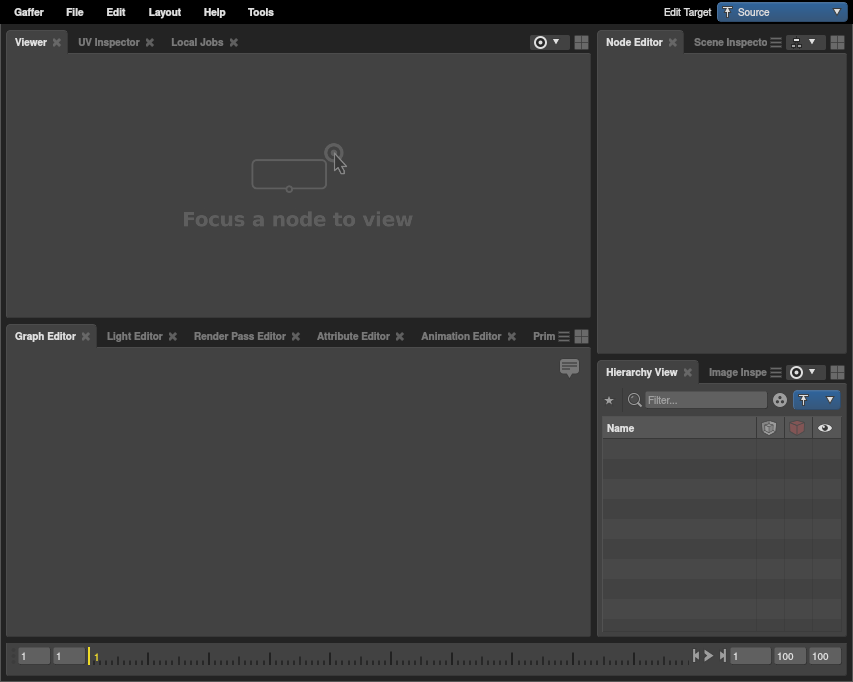 After installing Gaffer, launch Gaffer from its directory or by using the “gaffer” command. Gaffer will start, and you will be presented with an empty node graph in the default UI layout.