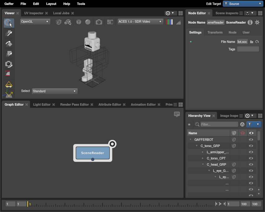 As Gaffer is a tool primarily designed for lookdev, lighting, and VFX process automation, we expect that your sequence’s modelling and animation will be created in an external tool like Maya, and then imported into Gaffer as a geometry/animation cache. Gaffer supports Alembic (.abc) and USD (.usdc and .usda) file formats, as well as its own native SceneCache (.scc) file format. Most scenes begin by importing geometry or images via one of the two types of Reader nodes: SceneReader or ImageReader.