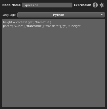 In this network, we drive the vertical translation of a cube primitive with the frame number. The frame will produce a different height result when the provided Context contains a different frame value.