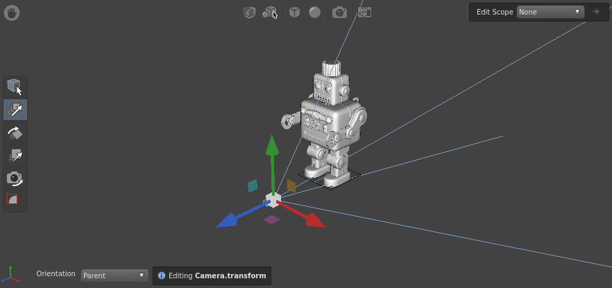4. In the Viewer, click the Translate Tool button. The translation manipulators will appear on the camera.