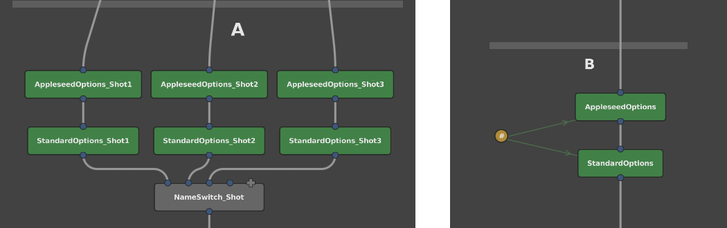 Figure 2. Two graphs that vary render options per shot. The graph on the left forks separate branches and options nodes for each shot, while the graph on the right uses a single branch and a Spreadsheet node.
