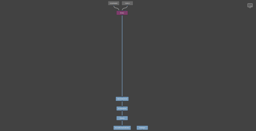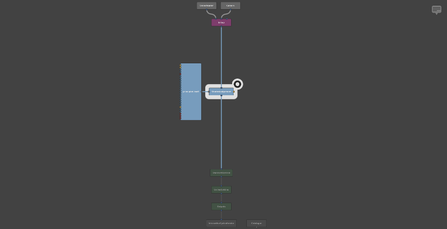 Click and drag the SceneReader node’s out plug (at the bottom; blue) onto the Group node’s in0 plug (at the top; also blue). As you drag, a node connector will appear. Once you connect them, a second input plug (in1) will appear on the Group node, next to the first.