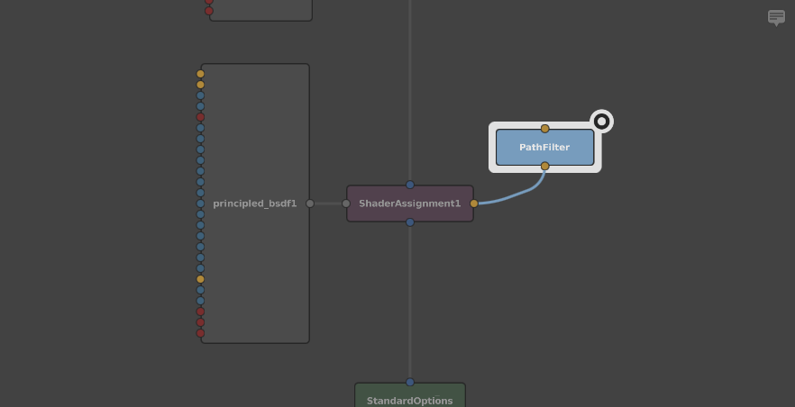 Click and drag the ShaderAssignment node onto the connector between the Group and StandardOptions nodes. The ShaderAssignment node will be interjected between them.