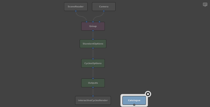 Finally, create a Catalogue node (Image > Utility > Catalogue). This is an image node for listing and displaying a directory of images in the Viewer. By default, it points to the default output directory of your graph’s rendered images. Place it next to the InteractiveCyclesRender node.