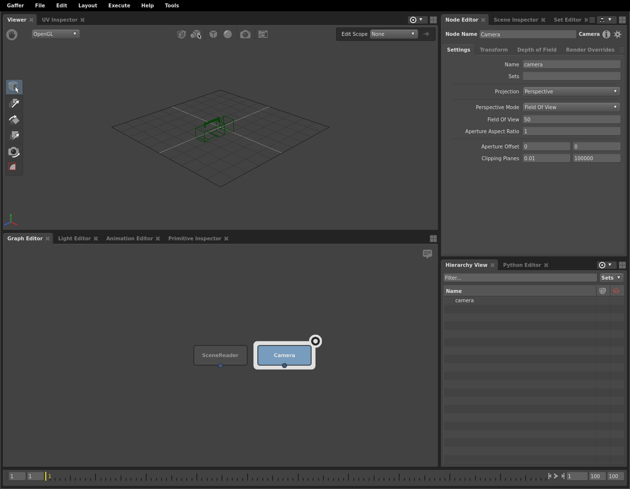 So far, your graph is as such: the SceneReader node is outputting a scene with Gaffy’s geometry, and the Camera node is outputting a camera object. In fact, the Camera node is outputting a whole scene containing a camera object. As such, any node that sends or receives scene data is classified as a scene node. This paradigm may be a bit confusing compared to other DCCs, but it is one of Gaffer’s strengths.