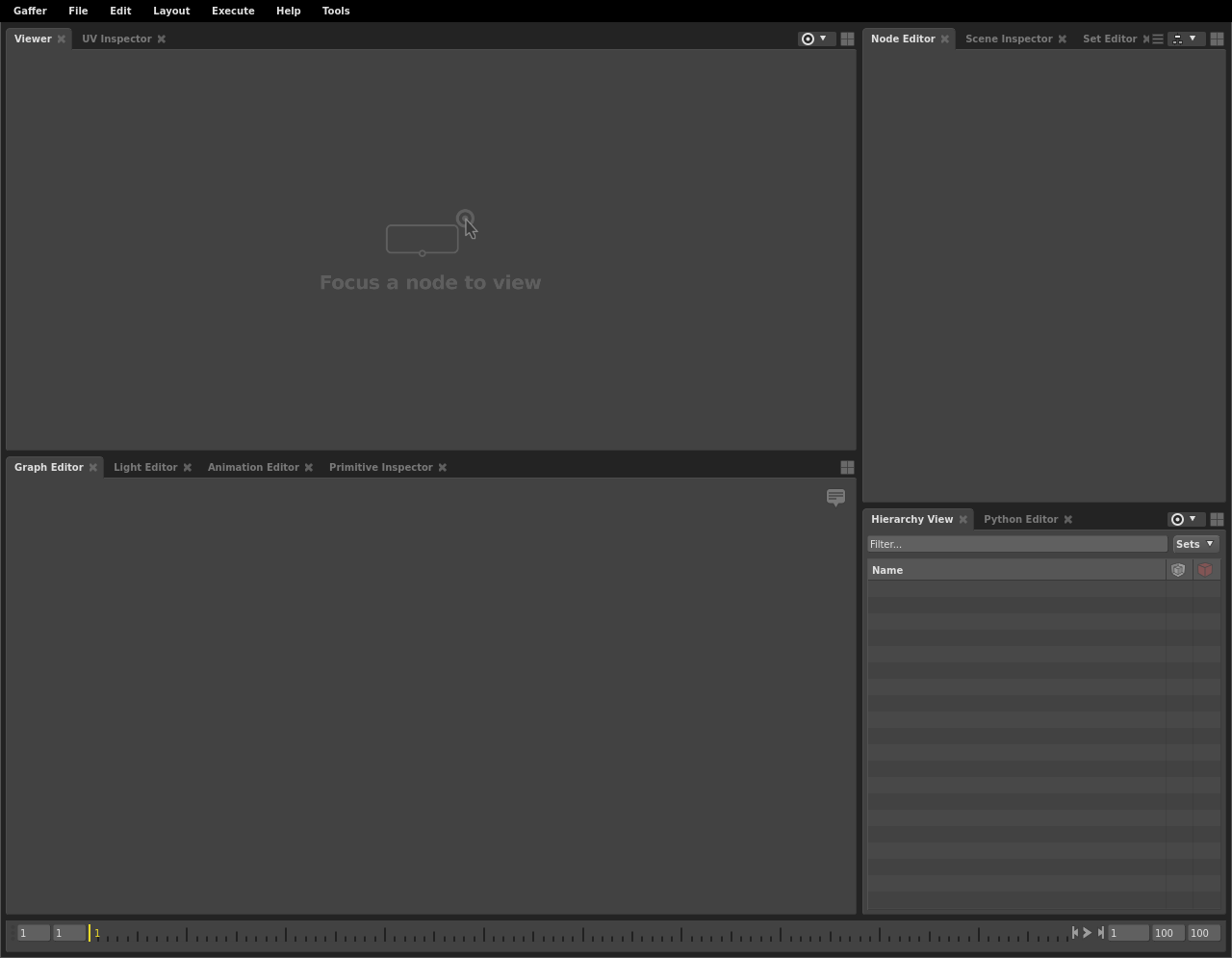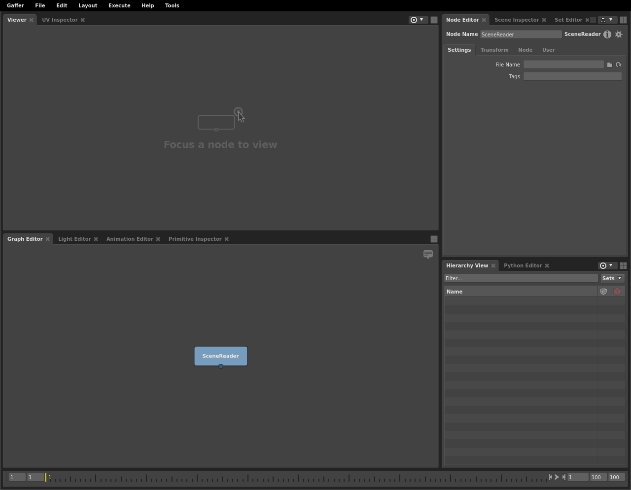 After installing Gaffer, launch Gaffer from its directory or by using the “gaffer” command. Gaffer will start, and you will be presented with an empty node graph in the default UI layout.