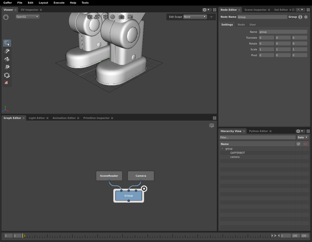 By the end of this tutorial you will have built a basic scene with Gaffer’s robot mascot, Gaffy, and render an output image. You will learn the following lessons, not necessarily in this order: