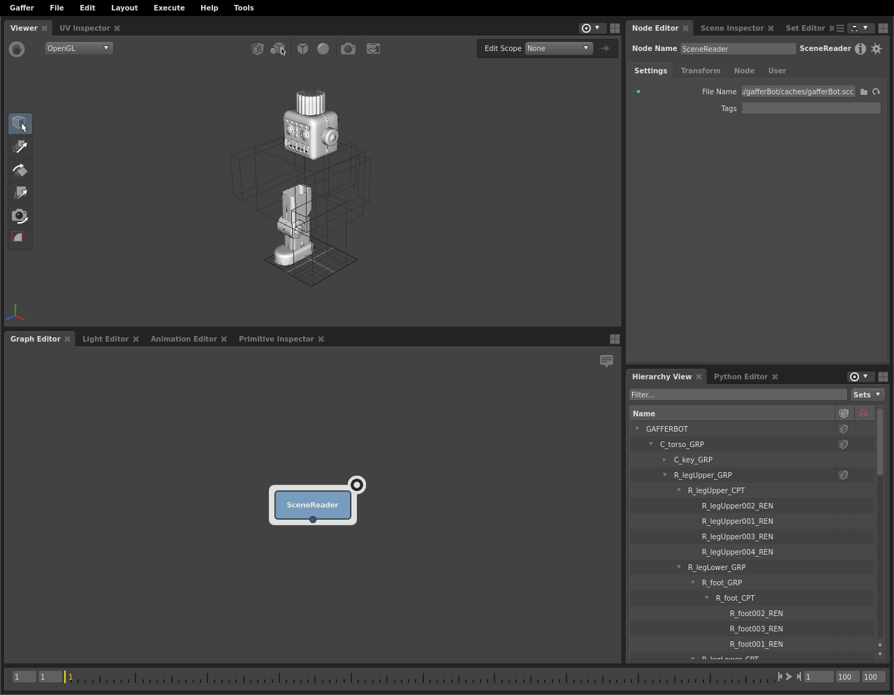 ${GAFFER_ROOT}/resources/gafferBot/caches/gafferBot.scc.Click the focus icon on the top right of the SceneReader to set it as the focus node, so that it will appear in editors set to follow focus, such as the viewer.