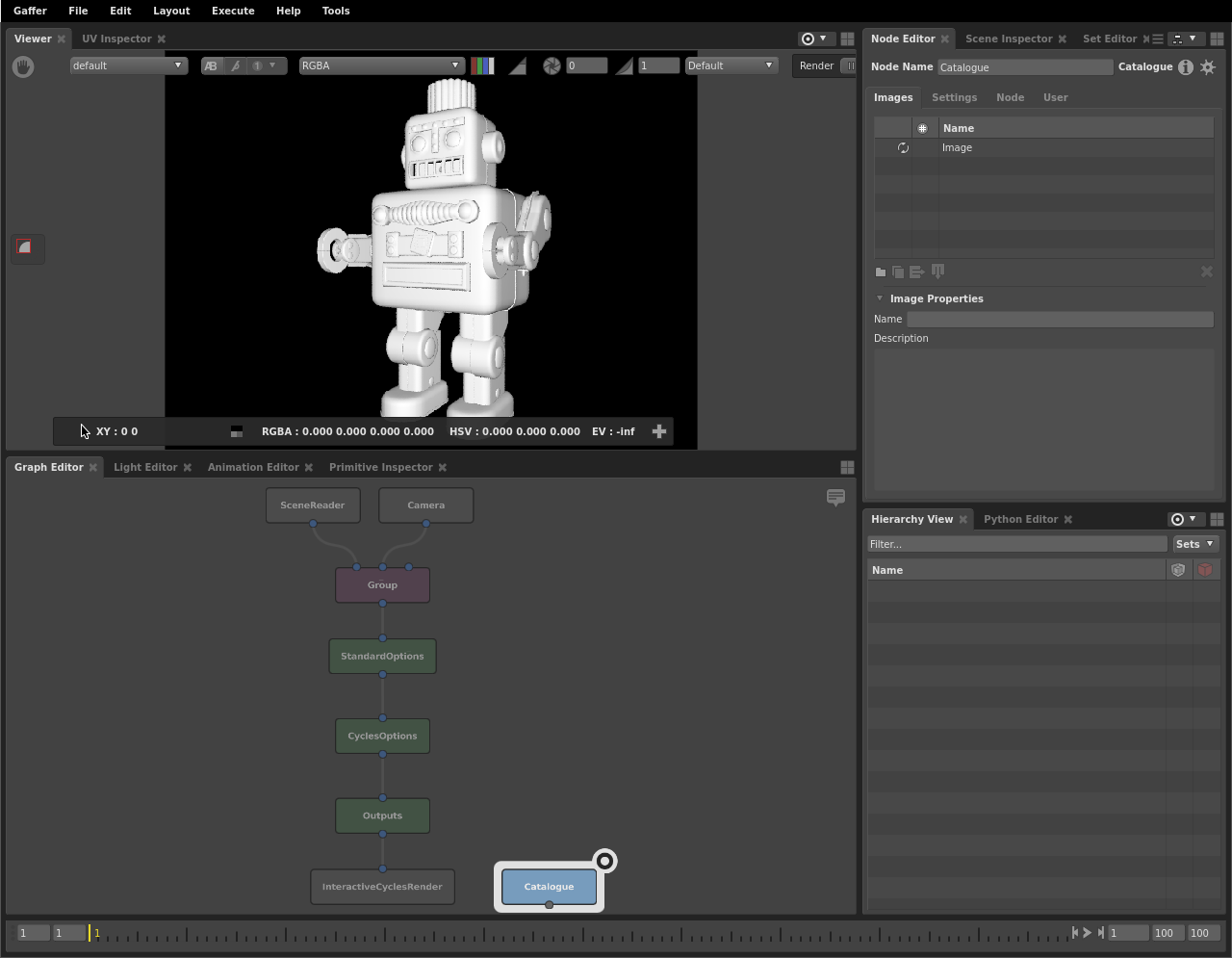 This tutorial uses Cycles, a free renderer included with Gaffer. While the Cycles-specific nodes described here can be substituted with equivalents from Arnold, Appleseed or 3Delight, we recommend that you complete this tutorial using Cycles before moving on to your preferred renderer.