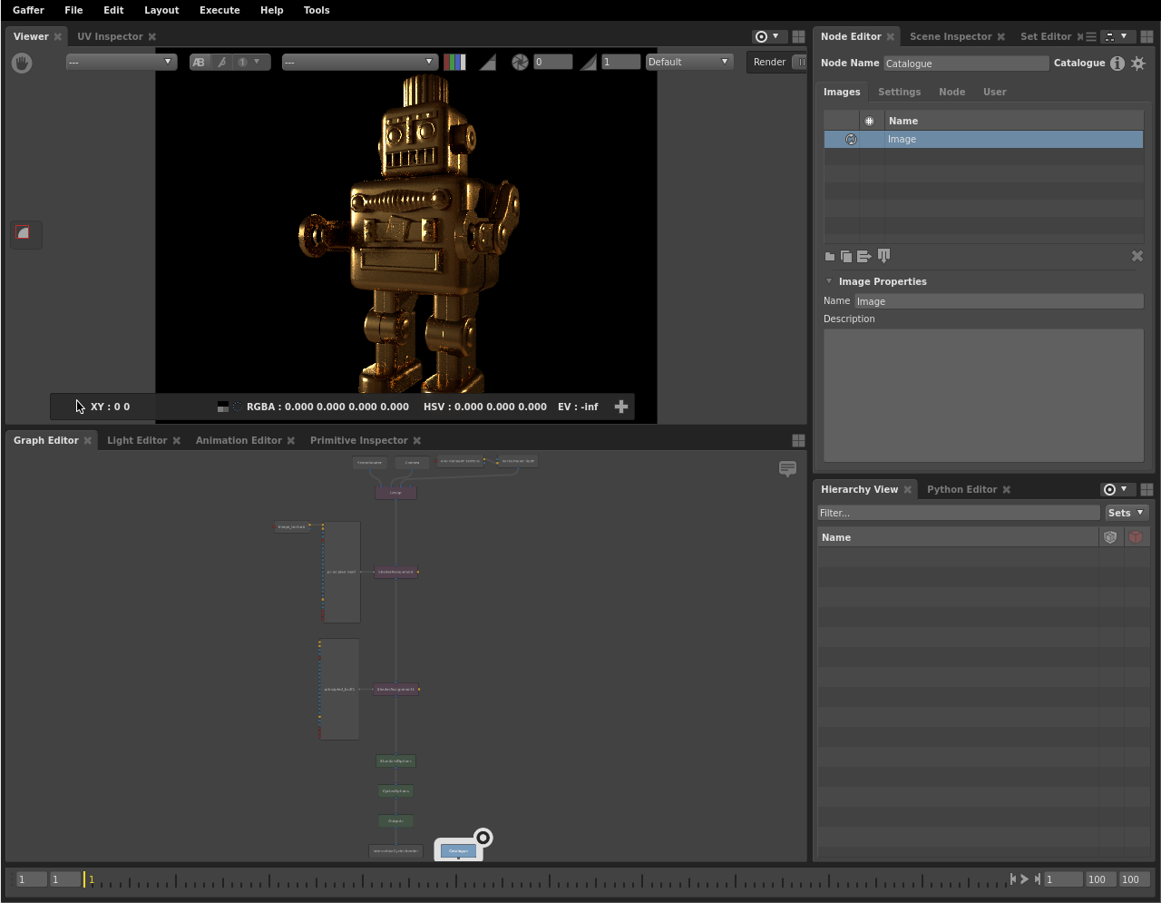 You should now have a basic understanding of Gaffer’s interface, the flow of data in a graph, how to manipulate the scene, and how to add geometry, lights, textures, and shaders.