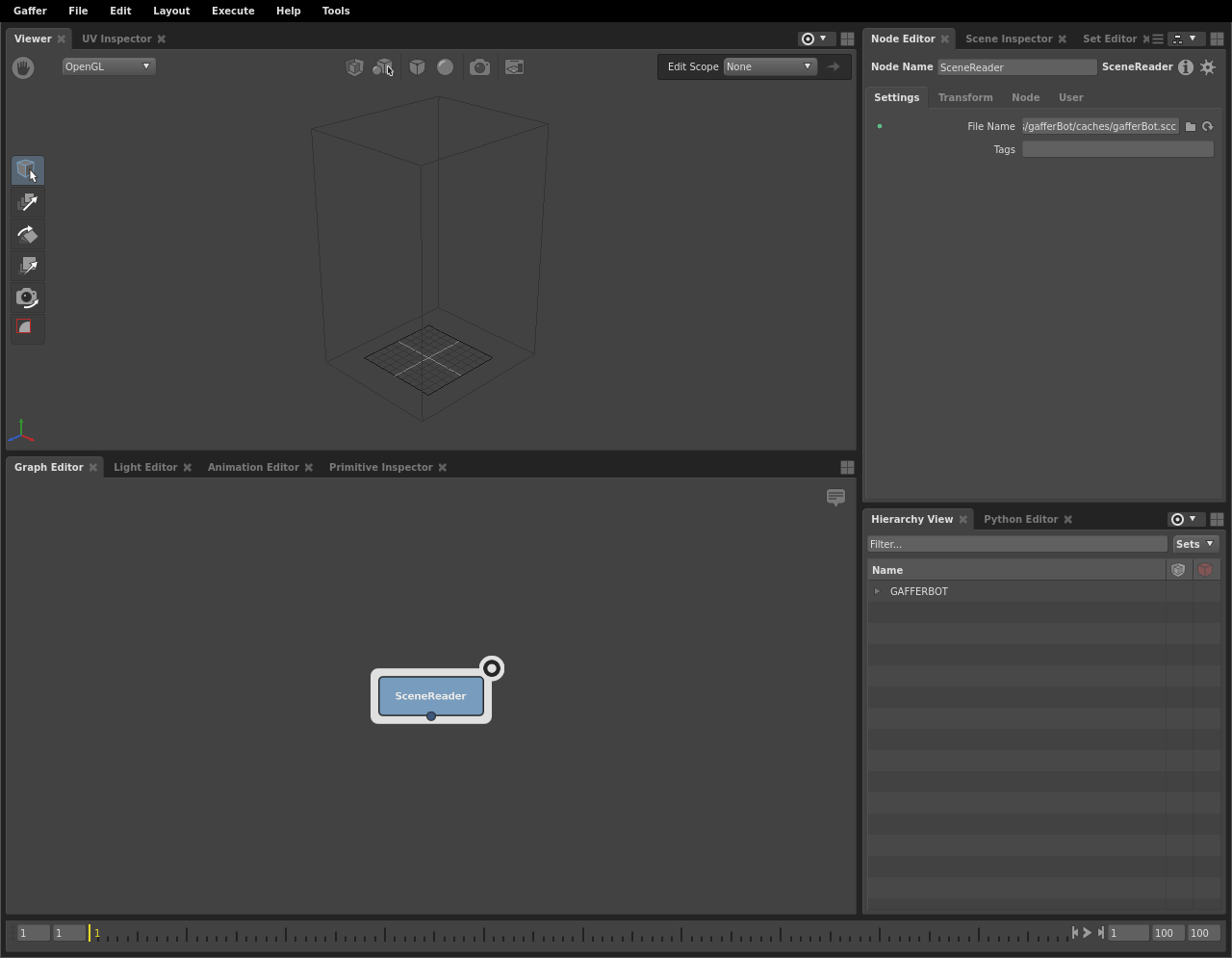 The SceneReader node has loaded, and the Viewer is showing a bounding box, but the geometry remains invisible. You can confirm that the scene has loaded by examining the Hierarchy View in the bottom-right panel. It too has updated, and shows that you have GAFFERBOT at the root of the scene. In order to view the geometry, you will need to expand the scene’s locations down to their leaves.