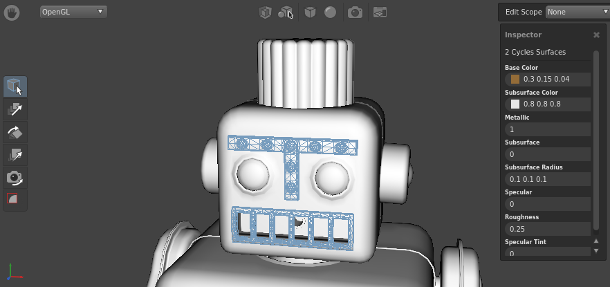 Right now, the physical surface of all of Gaffy’s geometry looks the same, because the shader is applying to every component of the geometry. To fix this, you should create an additional metallic shader and apply it selectively to different locations.