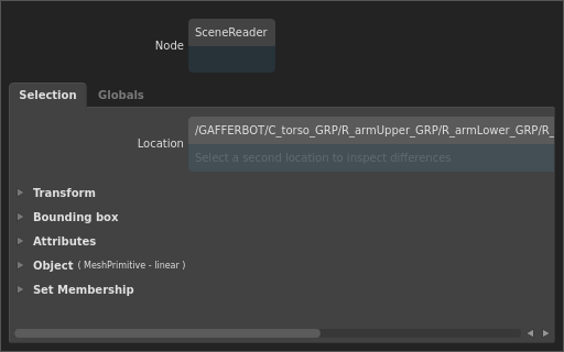 Each location has a number of properties that describe the content of the scene at that point in the hierarchy. They can be inspected in the Selection tab of the Scene Inspector. Each property of each location is computed independently, allowing Gaffer to generate the scene lazily on demand.