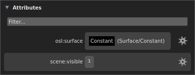The attributes store an arbitrary number of named values for the location. Gaffer defines standard attributes for object visibility, motion blur, and more. Additional attributes are defined to provide renderer-specific settings for things such as shader assignment, ray visibility and tessellation. Custom attributes may additionally be created by users for any purpose, often to control shading variation.