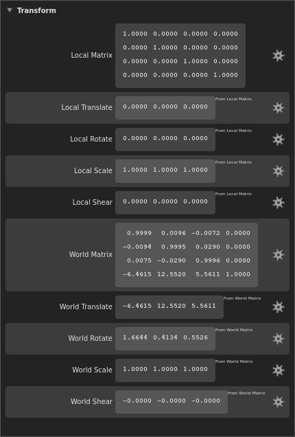 The transform contains a 4x4 matrix storing the local transformation of the location. It is used to position the location in 3D space using a combination of translation, rotation and scaling.