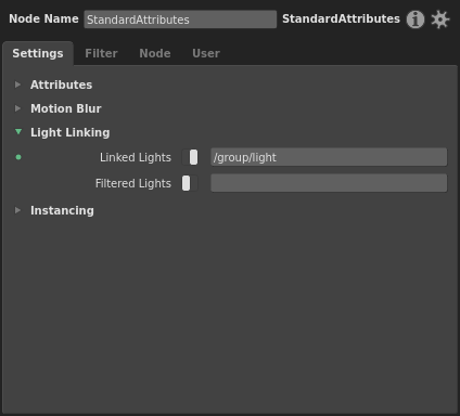 In a graph, in order to actually link a light to an object, you must connect a StandardAttributes node downstream of the object, filter for the object’s location, and then add a set expression to the Linked Lights plug.