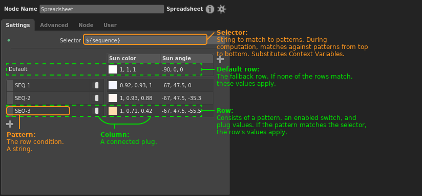 On a spreadsheet, each column drives a plug in the graph. Each row consists of a string pattern, an enabled switch, and a plug value per column. The selector is a string that is checked against each pattern. If the selector matches a pattern, the respective values in that pattern’s row apply to their connected plugs.