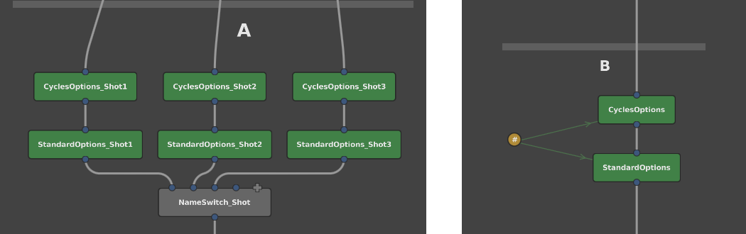 Figure 2. Two graphs that vary render options per shot. The graph on the left forks separate branches and options nodes for each shot, while the graph on the right uses a single branch and a Spreadsheet node.