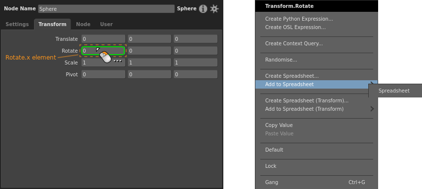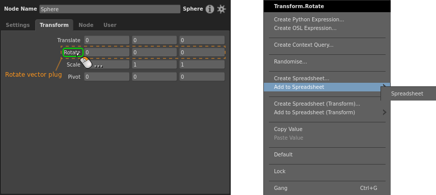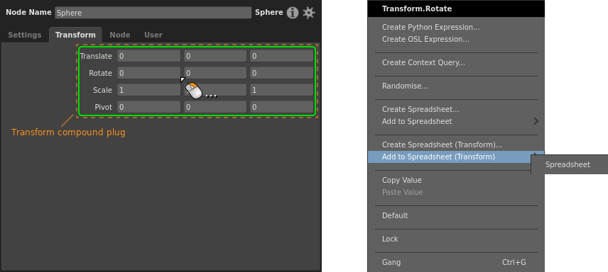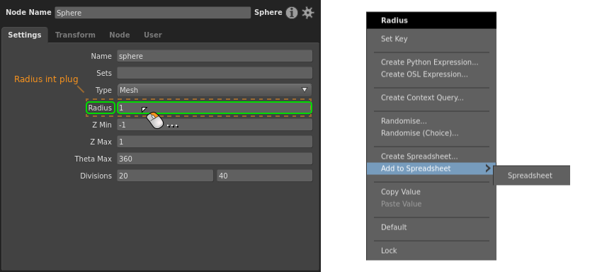 In a Node Editor, right-click the target plug, then select Create Spreadsheet… from the context menu.