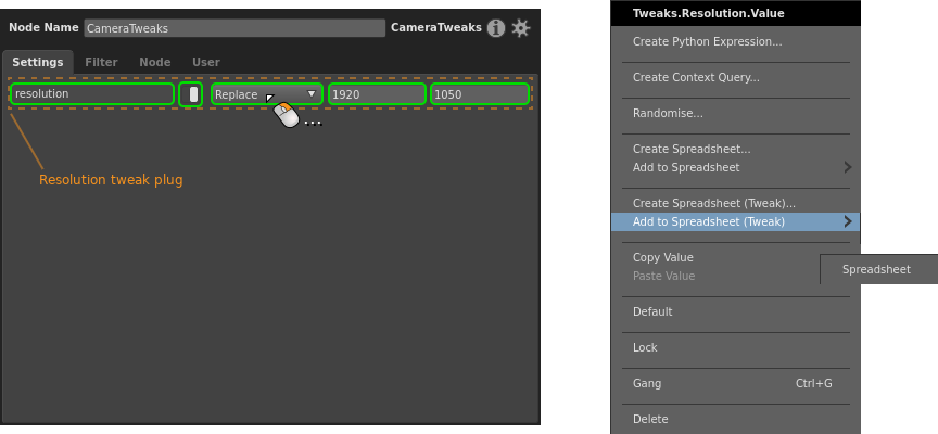 Right-click any editable element of the tweak plug, then select a spreadsheet from the Add to Spreadsheet (Tweak) sub-menu.