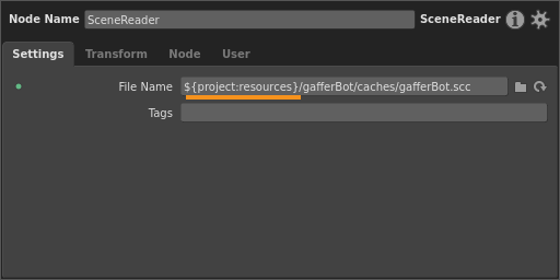 Success! Now every node graph you open or create will have the project:resources global Context Variable added to it. Try using the variable to load Gaffy’s scene cache: