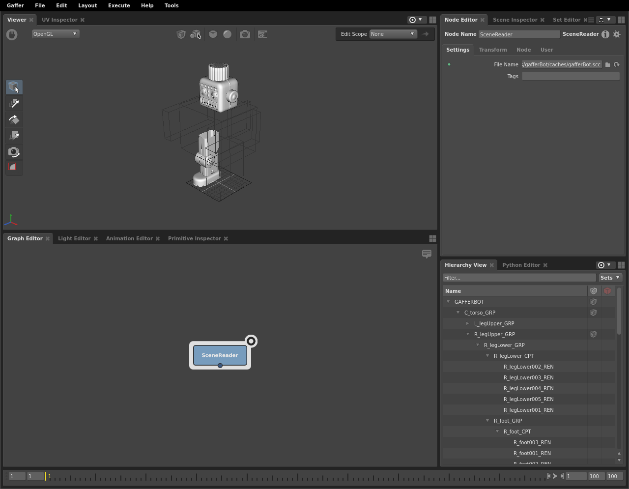 The SceneReader node has loaded, and the Viewer is showing a bounding box, but the geometry remains invisible. You can confirm that the scene has loaded by examining the Hierarchy View in the bottom-right panel. It too has updated, and shows that you have GAFFERBOT at the root of the scene. In order to view the geometry, you will need to expand the scene’s locations down to their leaves.