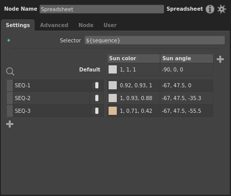 A Spreadsheet node will be added next to the existing node, and a new Node Editor window that is focused on it will open. The first column will be connected to the target plug. When editing the column’s cells, they will imitate the plug’s interface, including multi-element plugs, enabled switches, color previews and pickers, etc.