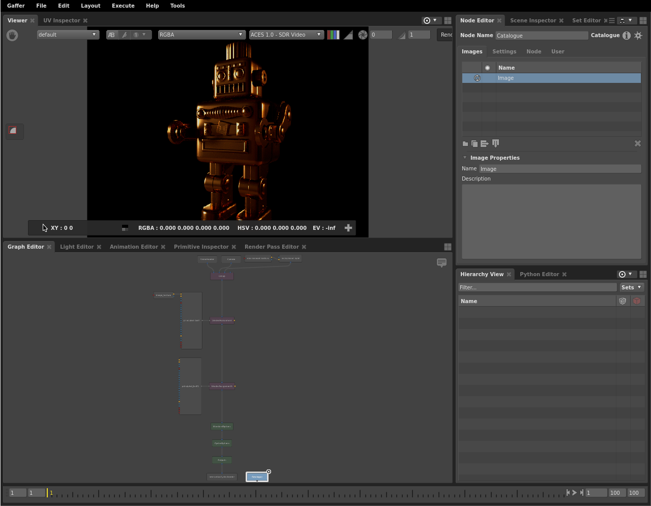 You should now have a basic understanding of Gaffer’s interface, the flow of data in a graph, how to manipulate the scene, and how to add geometry, lights, textures, and shaders.