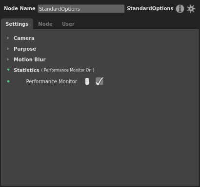 In the Node Editor, with the StandardOptions node still selected, navigate to Statistics > Settings.