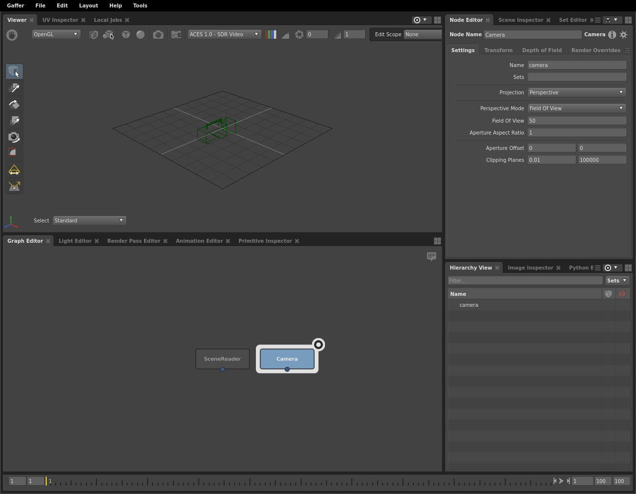So far, your graph is as such: the SceneReader node is outputting a scene with Gaffy’s geometry, and the Camera node is outputting a camera object. In fact, the Camera node is outputting a whole scene containing a camera object. As such, any node that sends or receives scene data is classified as a scene node. This paradigm may be a bit confusing compared to other DCCs, but it is one of Gaffer’s strengths.