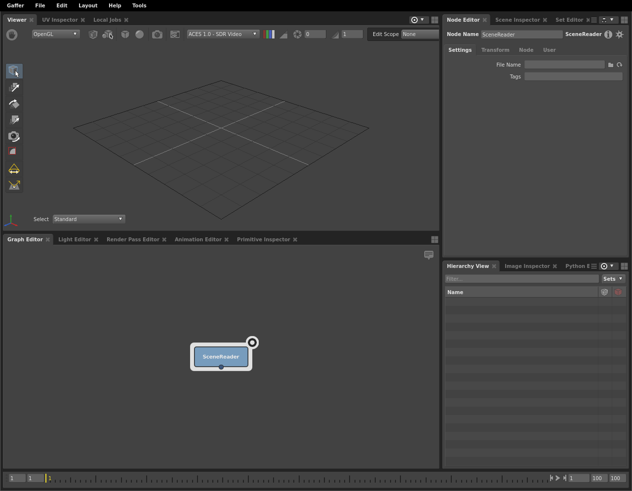 After installing Gaffer, launch Gaffer from its directory or by using the “gaffer” command. Gaffer will start, and you will be presented with an empty node graph in the default UI layout.