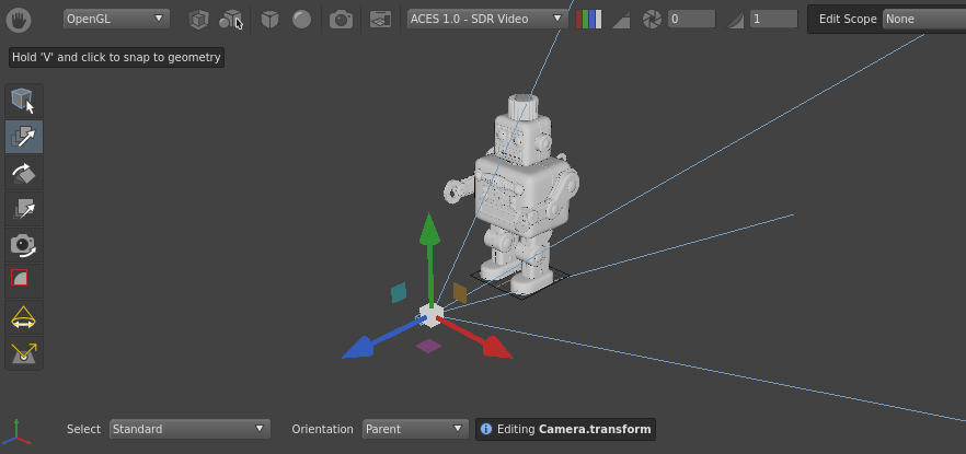 Next, you should reposition the camera so that it frames Gaffy. You can accomplish this using the built-in 3D manipulation tools in the Viewer.