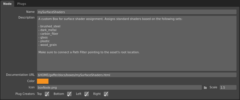 The metadata plugs of a Box, which comprise its name, description, documentation URL, and color, can be edited to better describe and provide support information for it. These plugs are preserved when the Box is exported as a reference script, so their values are crucial for authoring custom Reference nodes.