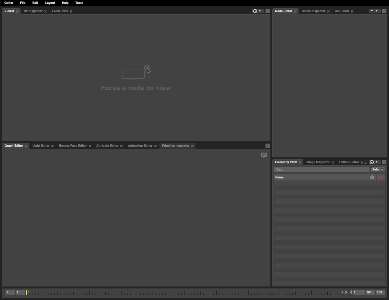 After installing Gaffer, launch Gaffer from its directory or by using the “gaffer” command. Gaffer will start, and you will be presented with an empty node graph in the default UI layout.