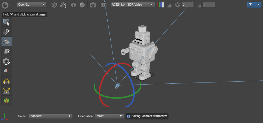 Next, you should reposition the camera so that it frames Gaffy. You can accomplish this using the built-in 3D manipulation tools in the Viewer.