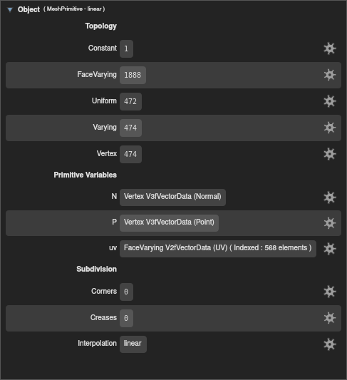 Primitive variables are properties of primitives (example primitive types include meshes, curves, and points). Common examples are “P”, which stores vertex positions, “N” which stores normals and “uv” which stores texture coordinates. In addition to these, objects can store any number of additional variables. Primitive variables can store a single value for the whole object, or can store values per-face, per-vertex or per-face-vertex.