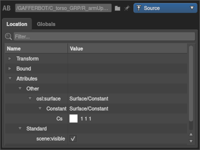 The attributes store an arbitrary number of named values for the location. Gaffer defines standard attributes for object visibility, motion blur, and more. Additional attributes are defined to provide renderer-specific settings for things such as shader assignment, ray visibility and tessellation. Custom attributes may additionally be created by users for any purpose, often to control shading variation.