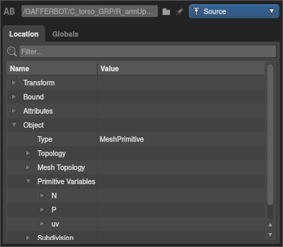 Each location has a number of properties that describe the content of the scene at that point in the hierarchy. They can be inspected in the Location tab of the Scene Inspector. Each property of each location is computed independently, allowing Gaffer to generate the scene lazily on demand.