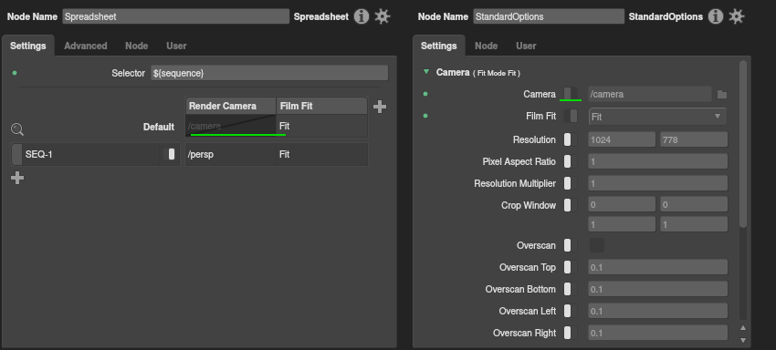 In production environments, spreadsheets are particularly effective at managing multi-render and multi-shot graphs while keeping them simple and easy to maintain. In a multi-shot rendering graph, a common temptation is to branch the graph, with separate render options nodes for each shot. But to save space and complexity, you could instead use a single branch and vary the node with a Spreadsheet node.