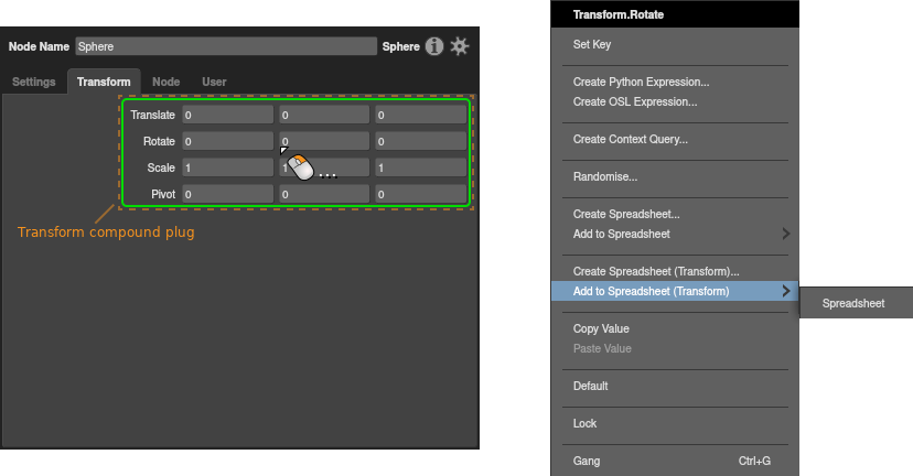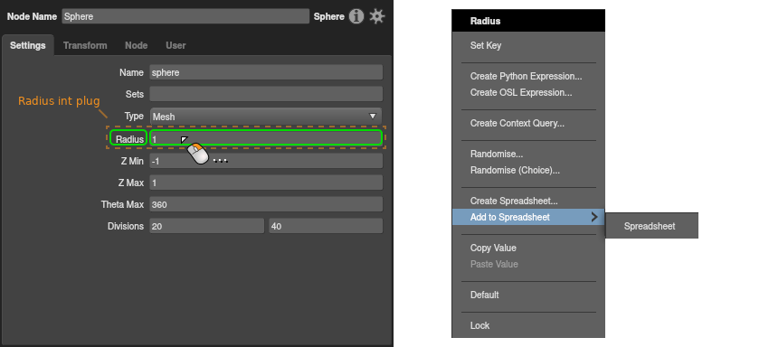In a Node Editor, right-click the target plug, then select Create Spreadsheet… from the context menu.