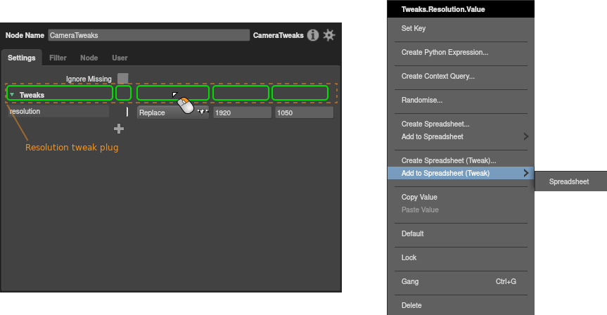 Right-click any editable element of the tweak plug, then select a spreadsheet from the Add to Spreadsheet (Tweak) sub-menu.