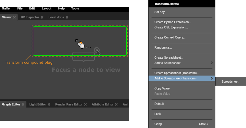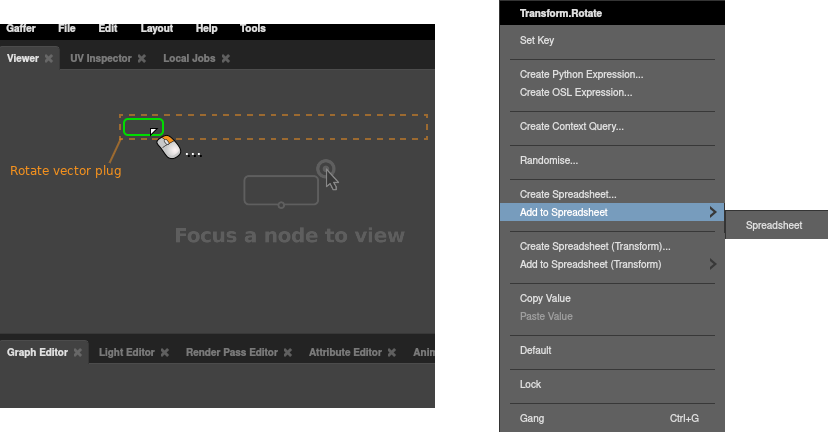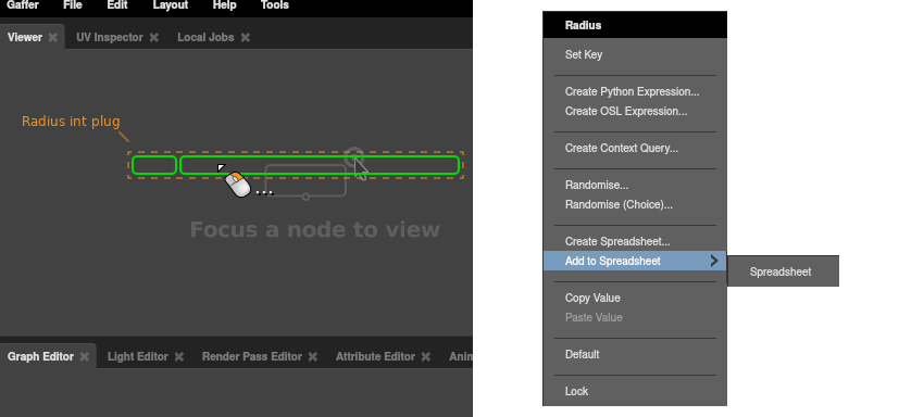 In a Node Editor, right-click the target plug, then select Create Spreadsheet… from the context menu.