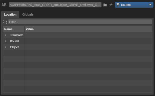 Each location has a number of properties that describe the content of the scene at that point in the hierarchy. They can be inspected in the Location tab of the Scene Inspector. Each property of each location is computed independently, allowing Gaffer to generate the scene lazily on demand.