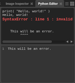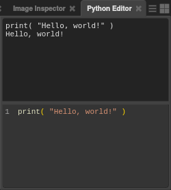 The Python Editor is split into two areas. The bottom-half is the input field. The top-half is the output. The input field of the Python Editor functions like a basic plain text editor. You can type, select, cut, copy, paste, and execute code.
