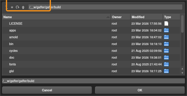 • Add a default bookmark, available to all file browsers in Gaffer.